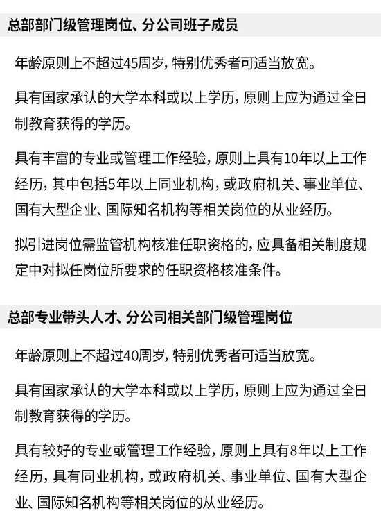 具体来看,总部部门级管理岗位、分公司班子成员、总部专业带头人才、分公司相关部门级管理岗位需满足以下资格条件。